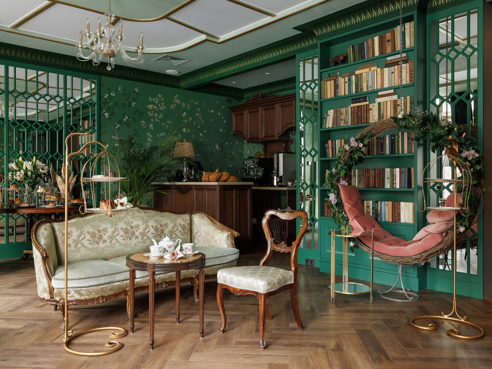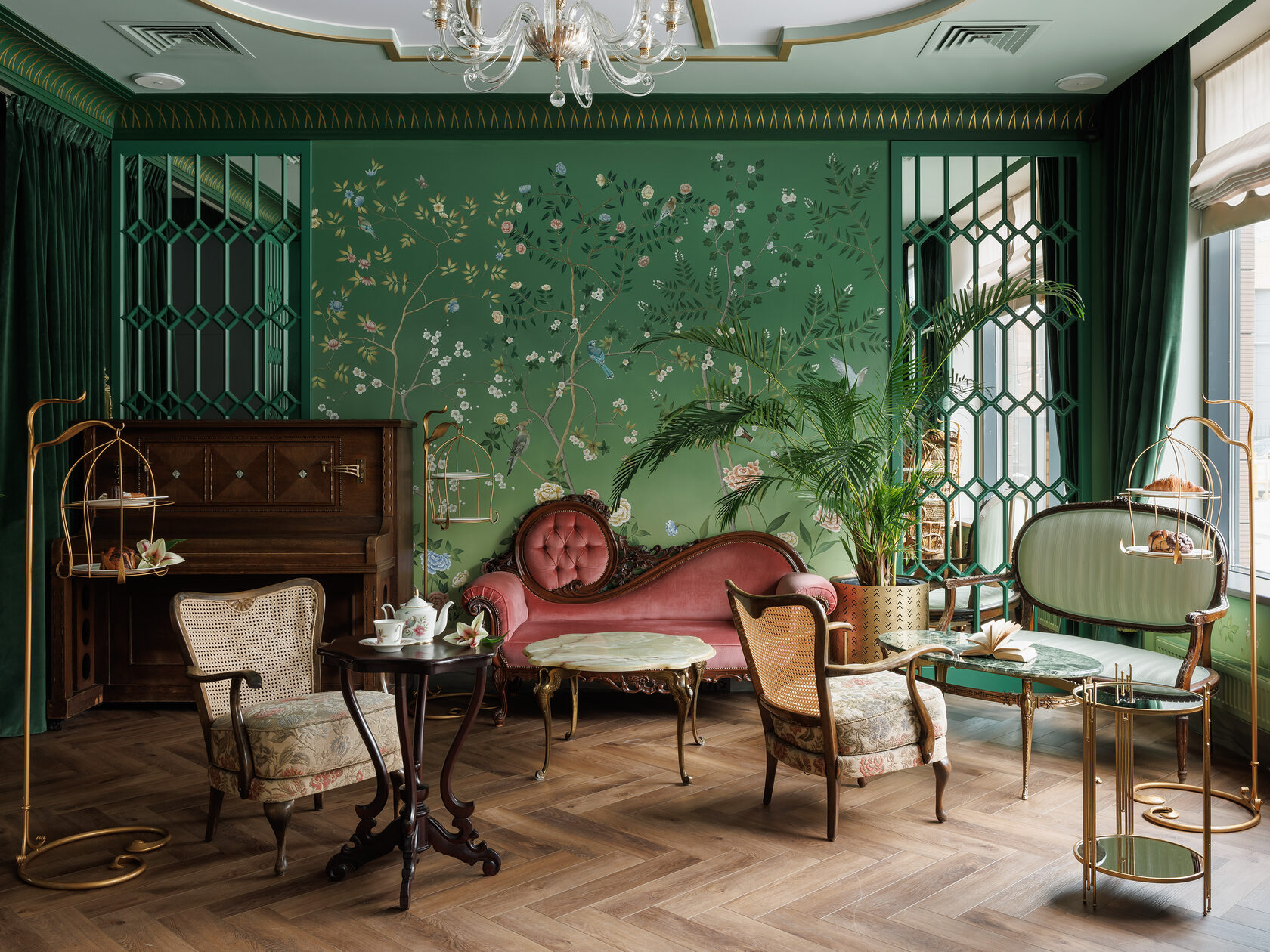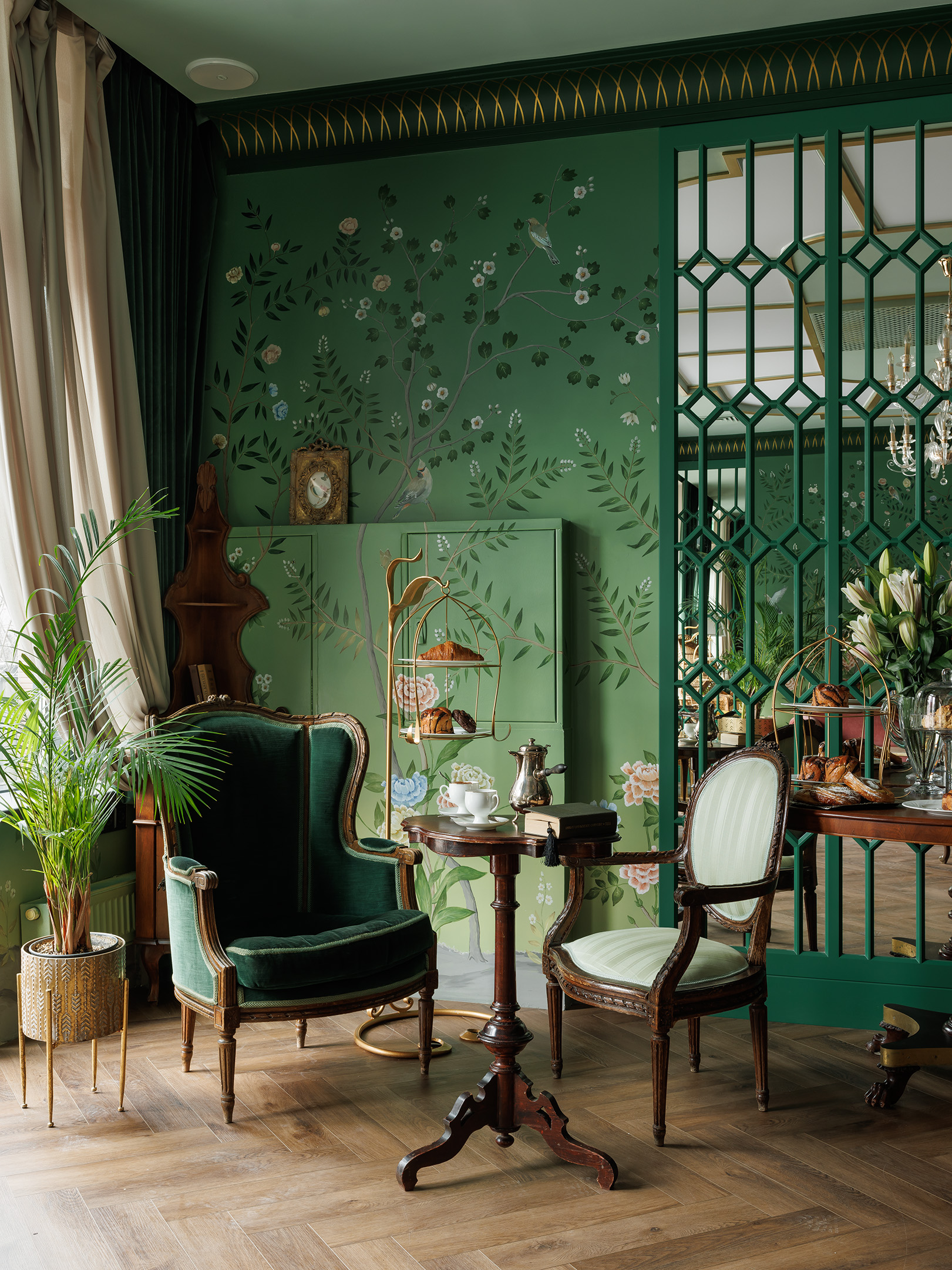 «Зелёная гостиная» — это закрытый клуб для романтиков и гедонистов: место, где спокойный свет, аромат чая и шёпот зелени создают паузу в ритме города. Интерьер отсылает к атмосфере старых европейских гостиных, но говорит современным языком — через тактильные материалы, продуманную мебель и живую роспись стен.