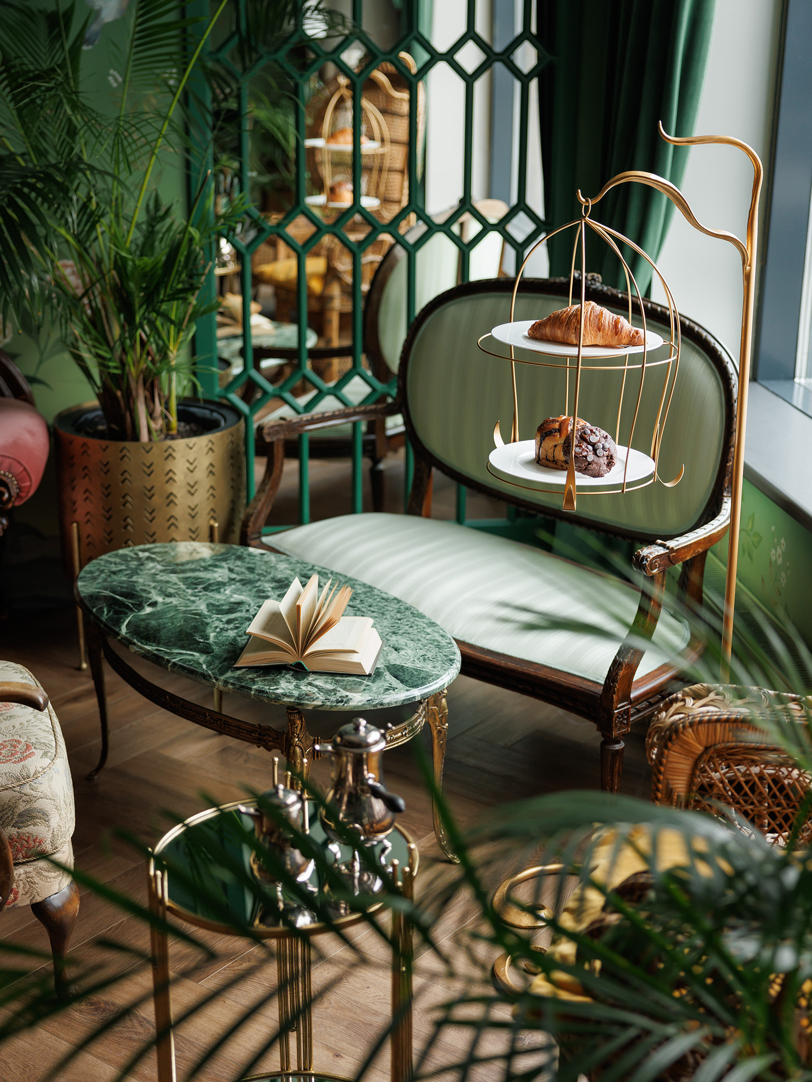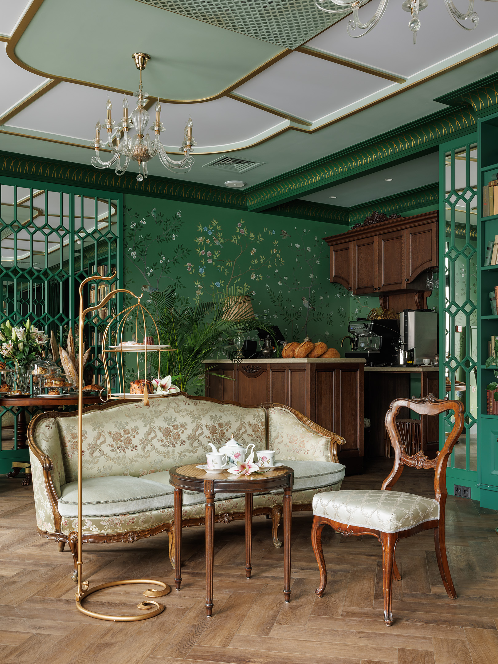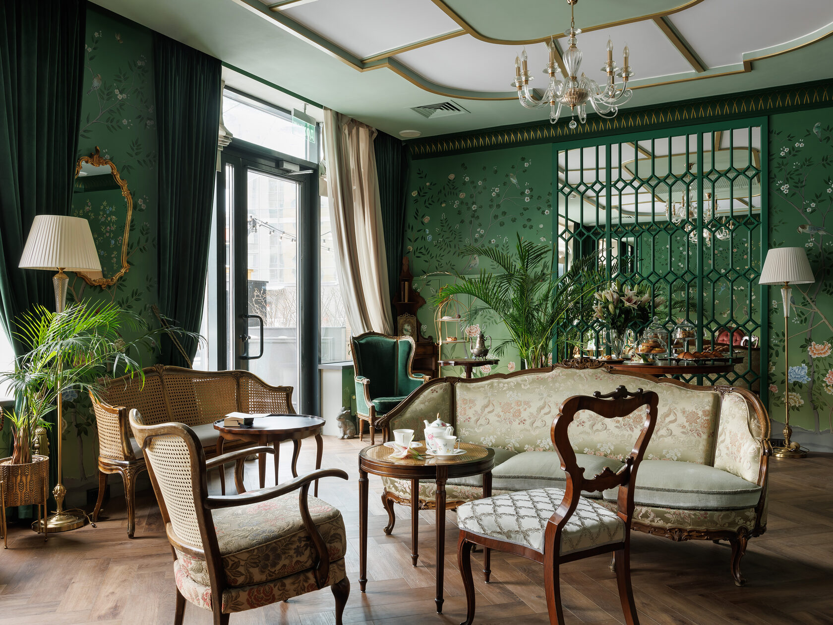 «Зелёная гостиная» — это закрытый клуб для романтиков и гедонистов: место, где спокойный свет, аромат чая и шёпот зелени создают паузу в ритме города. Интерьер отсылает к атмосфере старых европейских гостиных, но говорит современным языком — через тактильные материалы, продуманную мебель и живую роспись стен.
