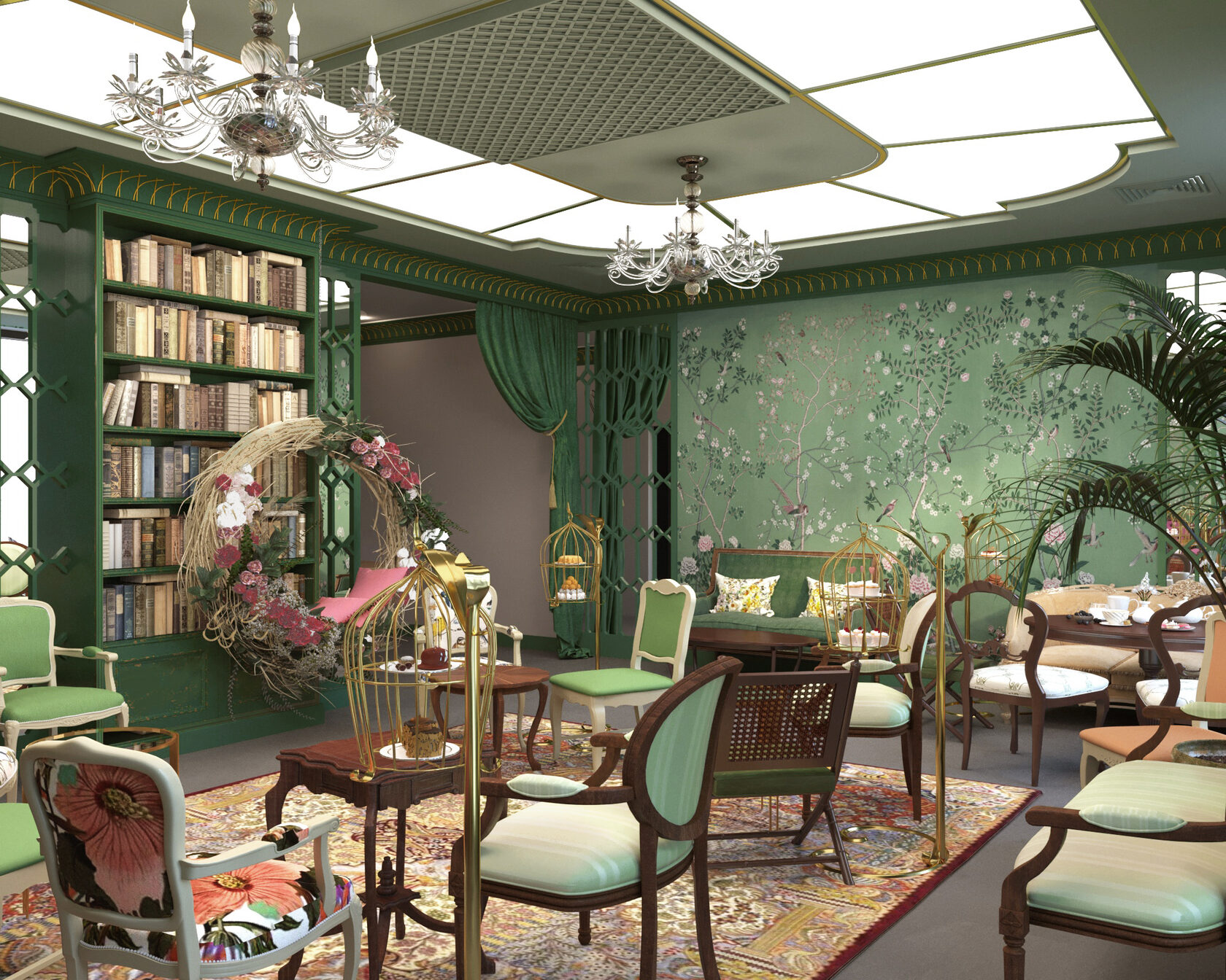 Идея не родилась одномоментно. Мы пробовали разные направления, пока обсуждение не пришло к образу литературных и музыкальных салонов XVIII–XIX веков — камерных, тёплых и полных смыслов. В голове возникла метафора «закрытой шкатулки» — «тайного сада», где каждая вещь — маленькое сокровище. Отсюда и шинуазри: европейская стилизация Востока, пропитанная мифом и нежной роскошью. Сразу возник образ интерьера салона как закрытой шкатулки, тайного сада, наполненного сокровищами. Идею сада поддерживают живые растения и зеркала, с декоративными решетками, имитирующими беседки.
