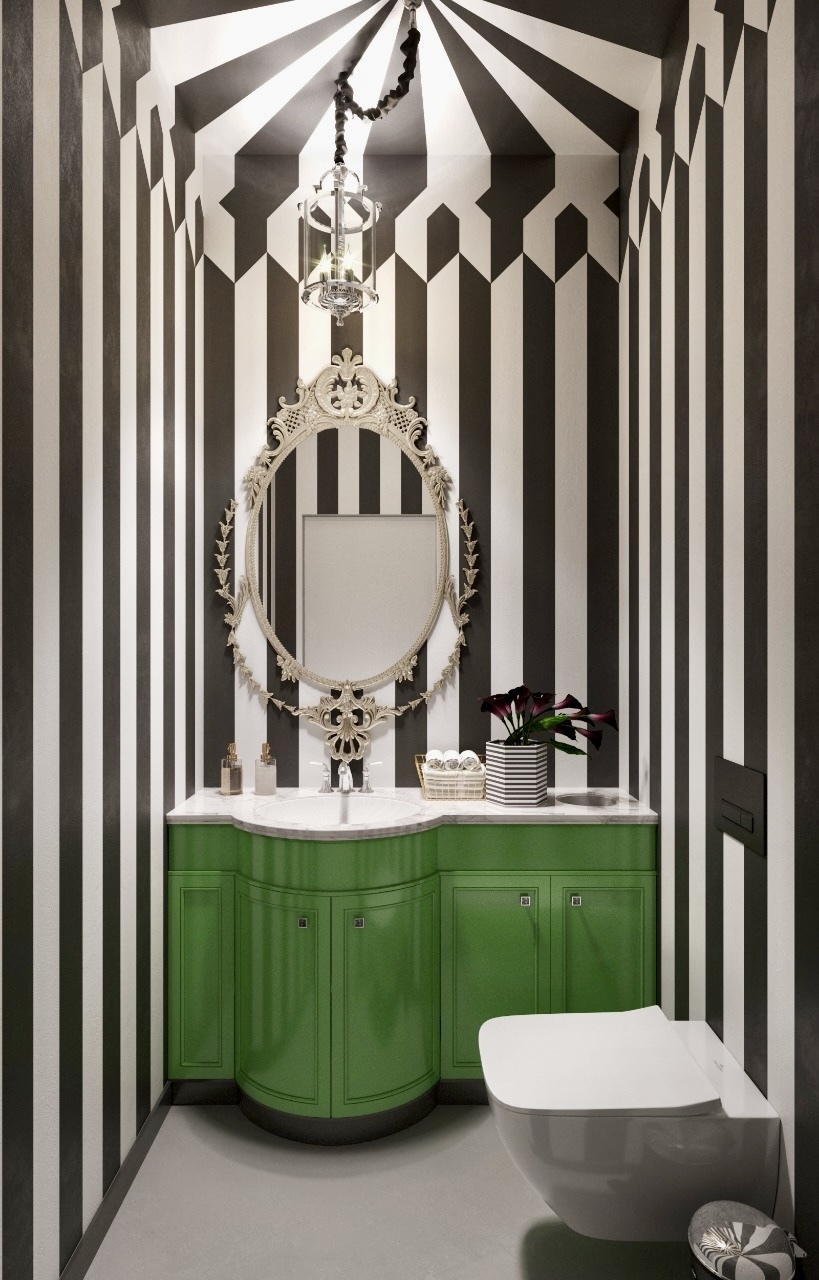 3D-рендеры стали рабочим инструментом: проверяли дневной и вечерний свет, фактуру бархата, блики на глянце витрин и отражения в зеркалах с коваными решётками. Визуализация помогла заказчику увидеть финал и принять ключевые решения — отказаться от готовых обоев в пользу художественной росписи и утвердить подбор антикварной мебели.