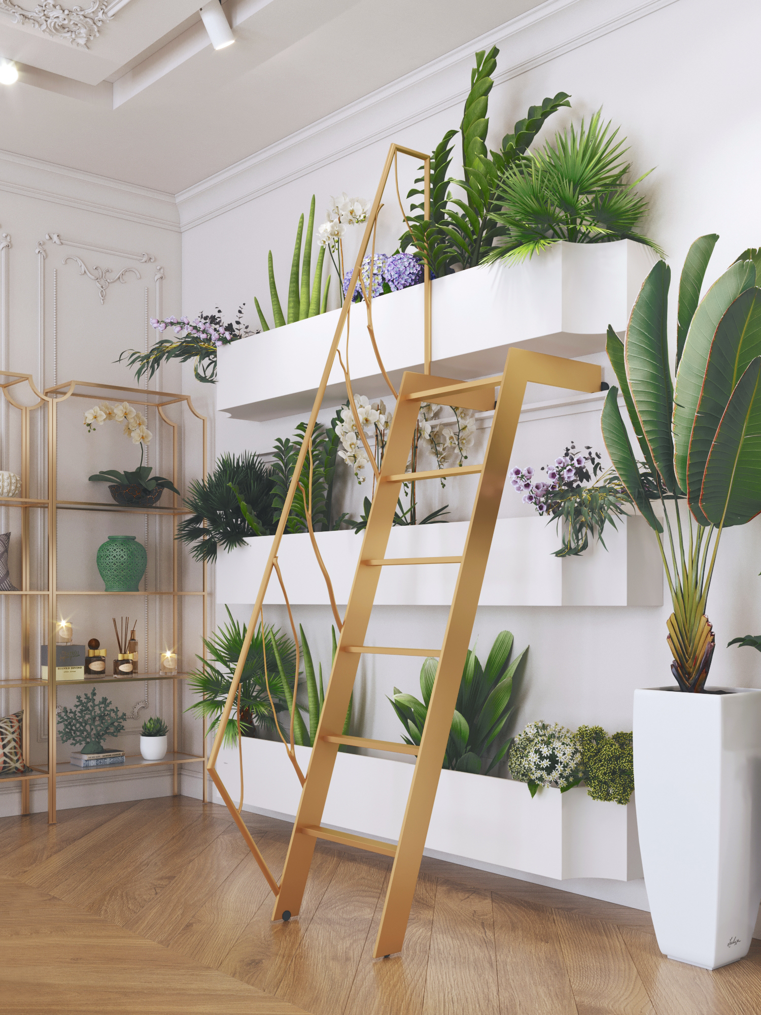 - стеллажи и мобильная лестница для продажи растений и декора, созданные по индивидуальным чертежам.