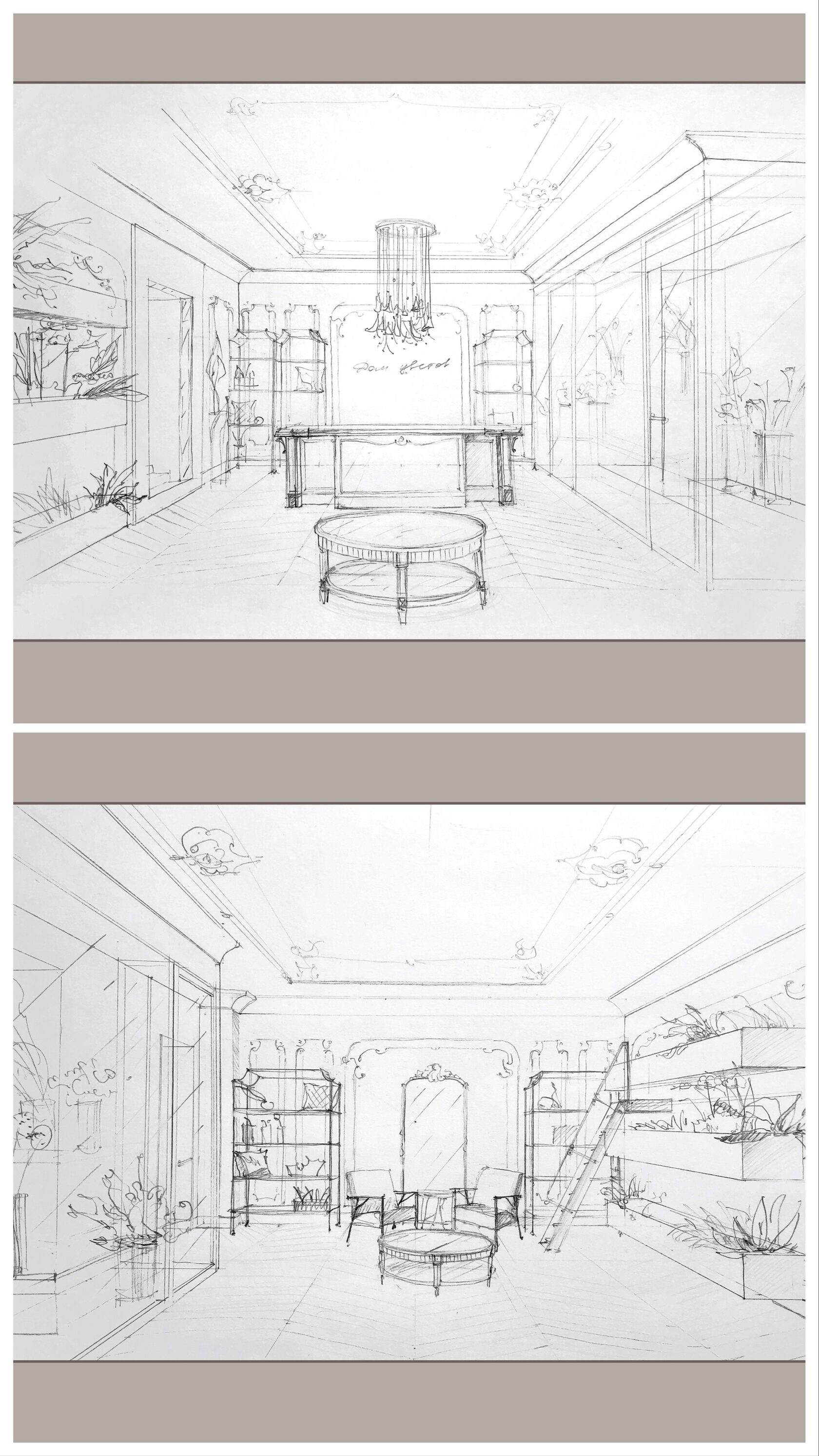 Карандашные наброски помогали распределить зоны так, чтобы гости чувствовали себя свободно: заходили, задерживались у стойки, рассматривали букеты, выбирали композицию.